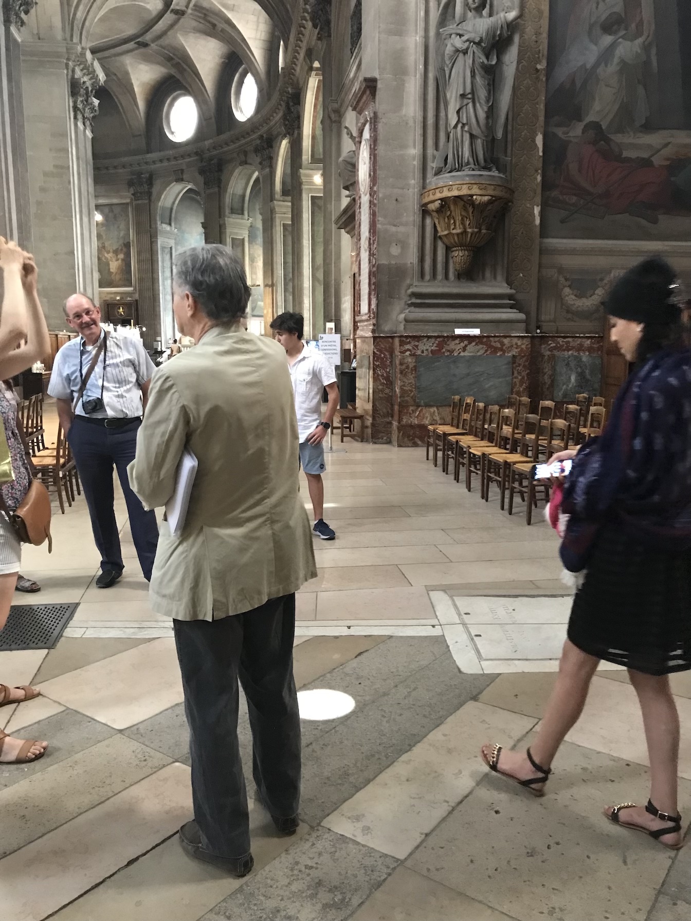 At right you see people watching the sun—that bright circle on the floor, which is focused there from a lens in a stain-glassed window—approach a division on the floor, which it will touch on the equinox. The marquis de Sade was