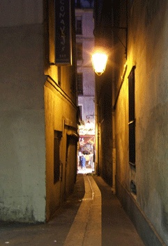 In the same general category, I suppose, are the little pedestrian streets between the boulevard Saint Michel and the rue Saint Jacques, including the rue de la Harpe, the rue Xavier Privas, the rue Saint-Séverin, and the rue du Chat Qui Pêche, the narrowest street in Paris (photo below). These streets date back to the Middle Ages, generally around the 12th century.