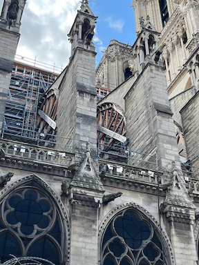 Notre Dame. Everybody knows a horrendous fire all but destroyed the cathedral on April 15, 2019. Some people do not know that the fire damage was so severe the entire ediface nearly collapsed (and Tom was enraged recently when photographing the renovations and a stupid American hipster actually flipped his ponytail as he walked by and said, "It's a building; it can be fixed.") The fact is that the flying buttresses, which allowed for the construction of such high and heavy walls with windows in them by counter-balancing their weight, nearly collapsed when the weight of the roof—most of which was destroyed, along with the cathedral's